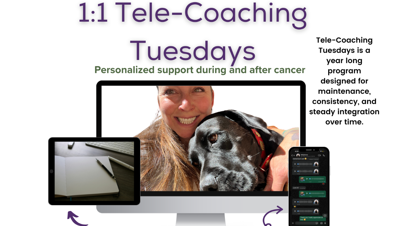 Tele-Coaching Tuesdays is a year-long 1:1 support container designed for humans navigating life during and after cancer who want consistent guidance without intensity.
